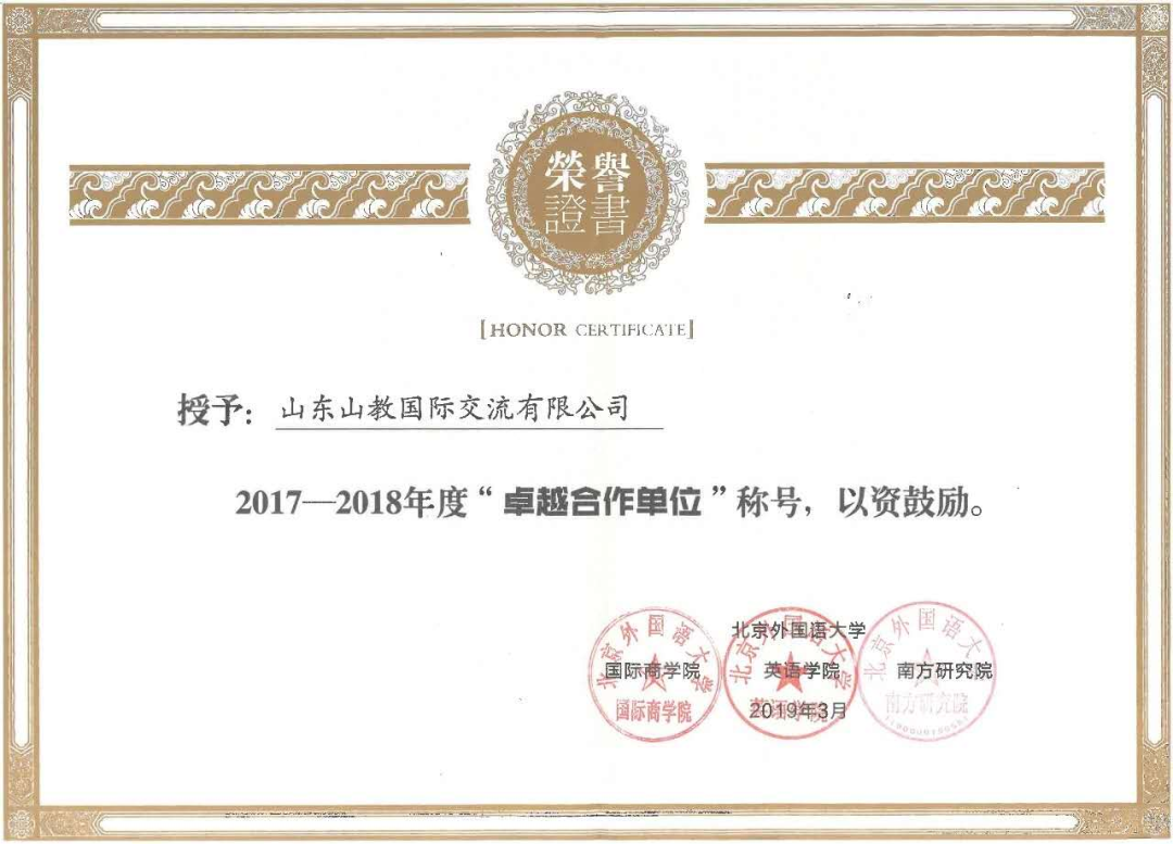 2015年 山教旗下出国留学培训基地在济南市民政局组织的社会组织评估活动中获得“3A”等级,被济南市民政局评为“2014年度规范化社会组织示范单位”