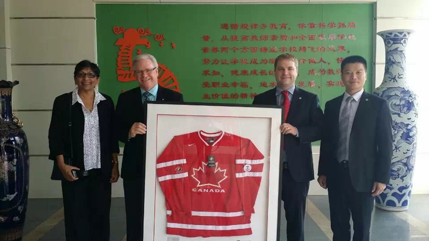 加拿大阿布茨福教育局考察团像该校赠送2010年温哥华冬奥会加拿大冰球队夺冠
