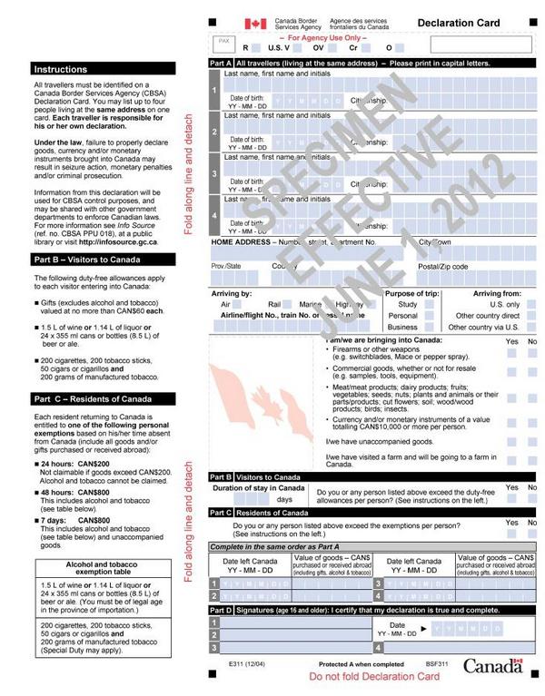 须仔细阅读“入境和海关申报卡/E311卡”(CBSA Declaration Card),填写注意事项请参考附件1。如有不清楚之处,切勿随意填写,不写或隐瞒不报,应在机场向CBSA人员询问。如未如实申报货物及货币,被查出后,可能会导致被没收、扣押、重罚或刑事起诉。