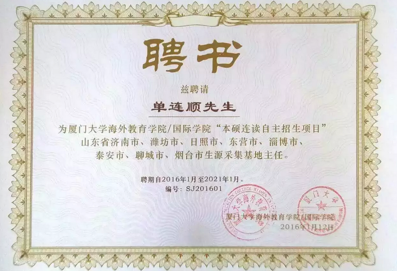 单连顺被聘为厦门大学海外教育学院/国际学院山东省生源采集基地主任