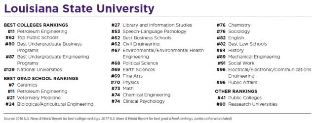 · LSU是美国为数不多的几所被政府同时授予土地(Land-grant)、海域(Sea-grant)和太空(Space-grant)用于科研工作的大学。