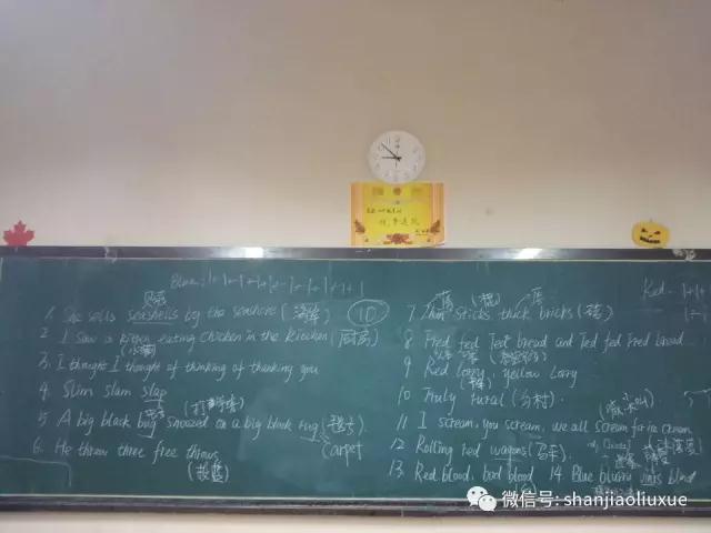 首先课间板书比赛所需要的绕口令,在这期间学生有陌生的单词自行查询字典,培养学生主动查字典的能力。如有不会的发音可随时咨询两外外教以及两位中方英语老师。