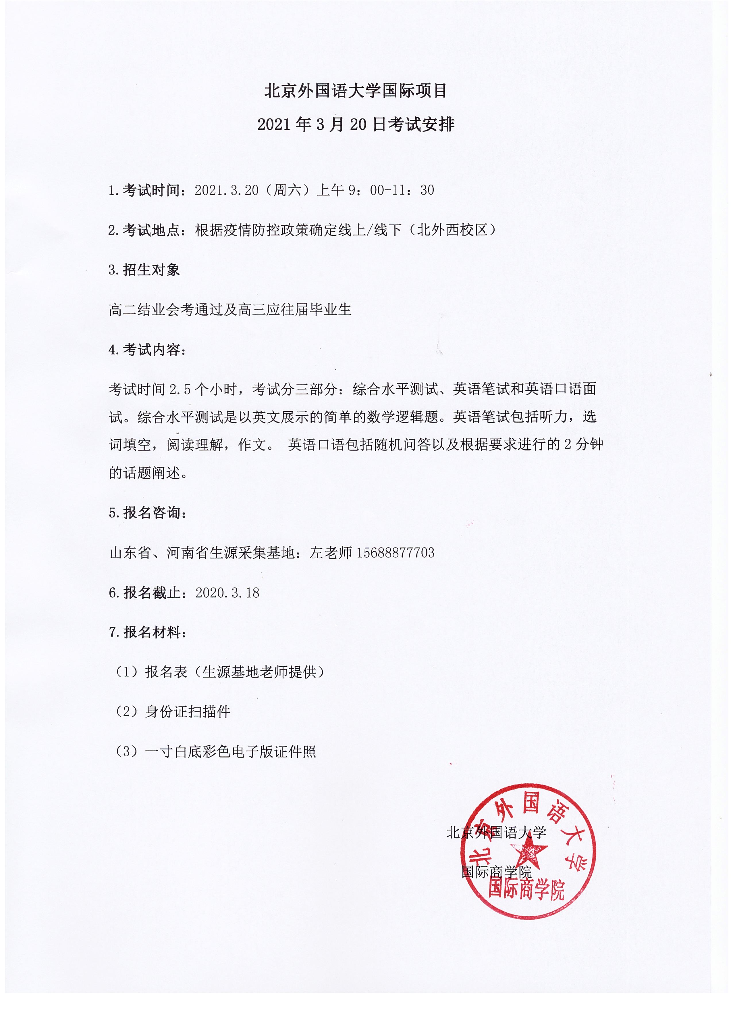 2021年秋季北京外国语大学国际项目入学考试安排,请查收 【考试时间】2021.3.20 【报名咨询】15688877703左老师