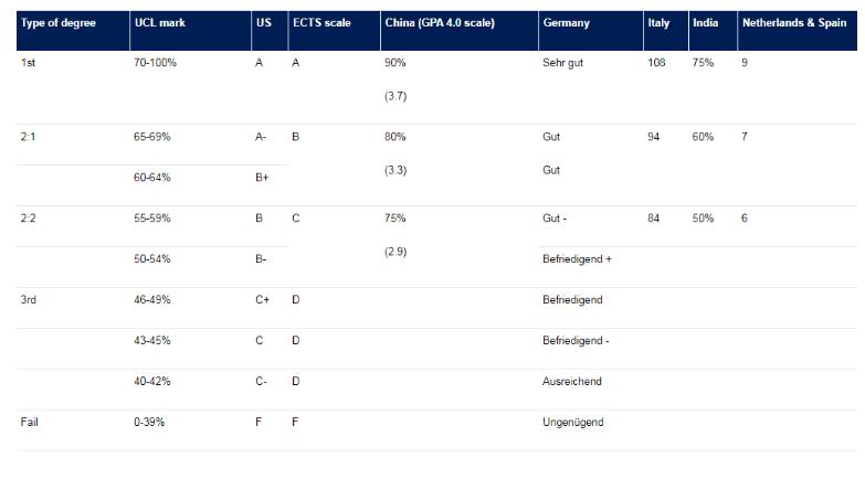 英国大学本科一等学位大概相当于中国大学GPA的 90%,2.1学位相当于 80%,2.2学位相当于 75%。下面是UCL本科学位等级与各国成绩对照。