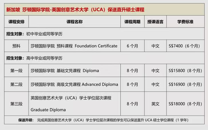 • 高中毕业或同等学历的学生在莎顿国际学院依次完成:专业基础文凭课程(8 个月)、专业高级文凭课程(8 个月),本科学位及相应学历层次文凭课程 (8 个月)。三个阶段共计 24 个月(全部在新加坡完成),相应学历文凭课程即可选择英国格鲁斯特大学(UOG)学士学位课程 BA(Hons),毕业后获得英国格鲁斯特大学授予的学士学位,也可选择英国创意艺术大学(UCA)学士学位层次课程Graduate Diploma,毕业后可保送直升UCA硕士学位课程(1 学年)。